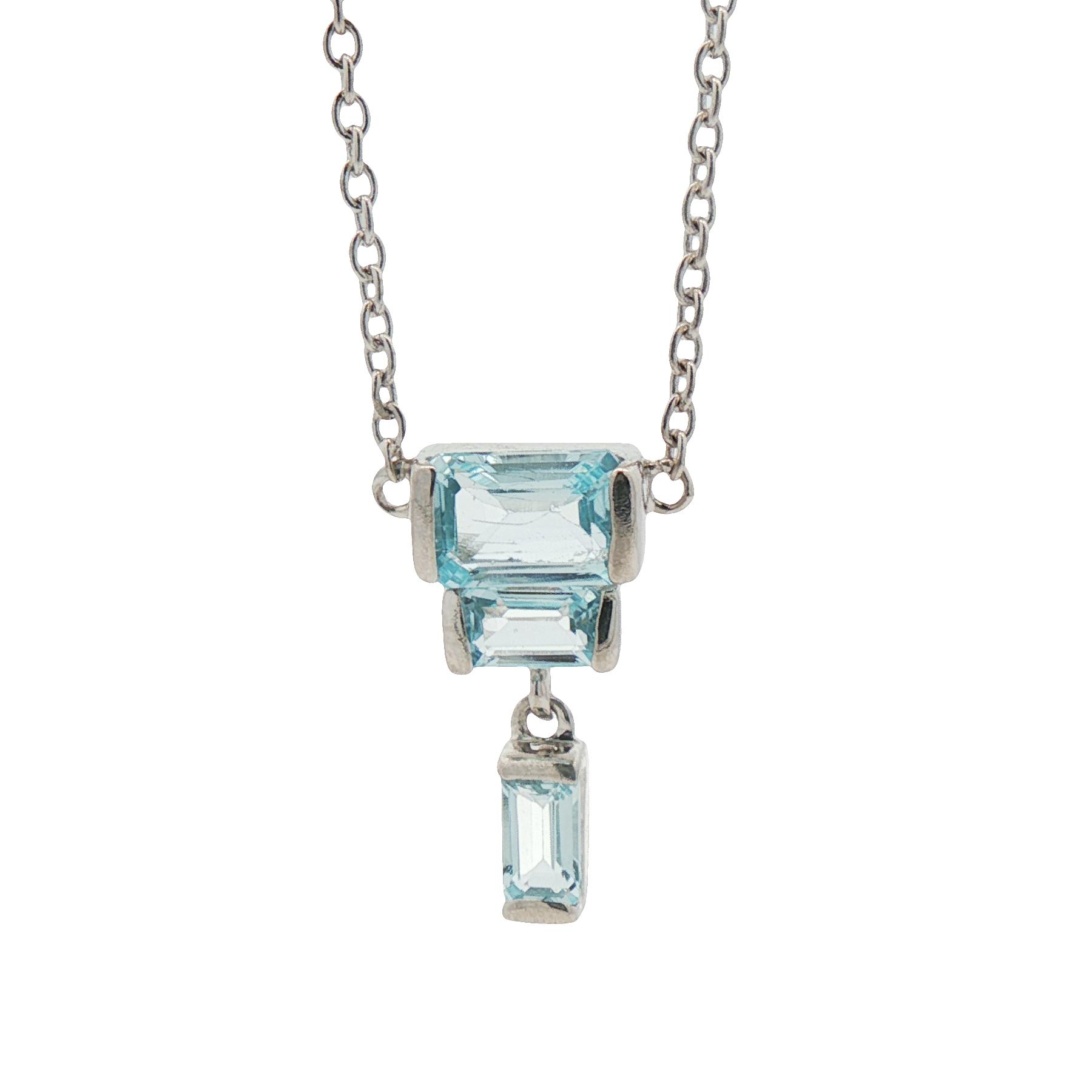 Sterling silver pendant set with 3 emerald-cut blue topaz on a 16/17/18″ adjustable sterling cable chain.  Pendant is 3/4″ in total length.