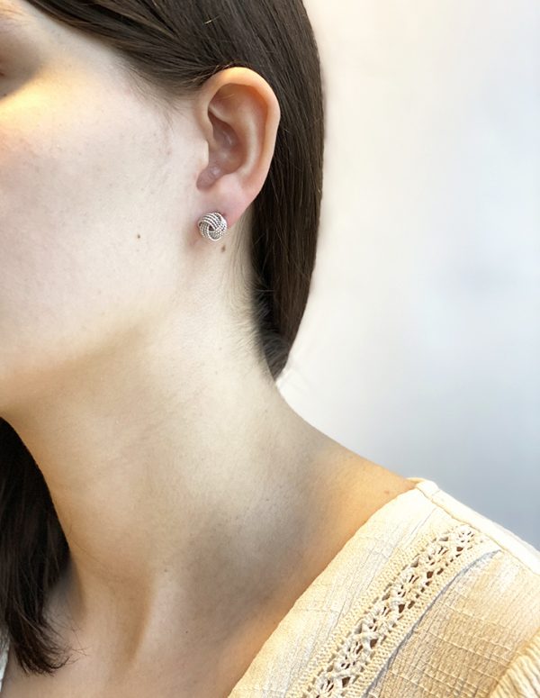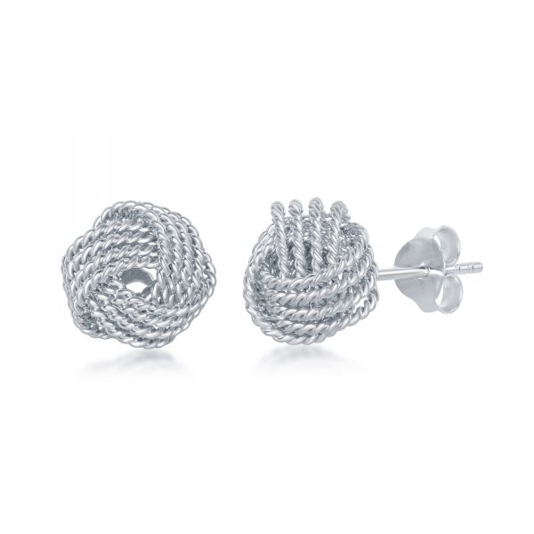 Sterling silver rope love knot stud earrings. Approximately 9.5mm in diameter.
