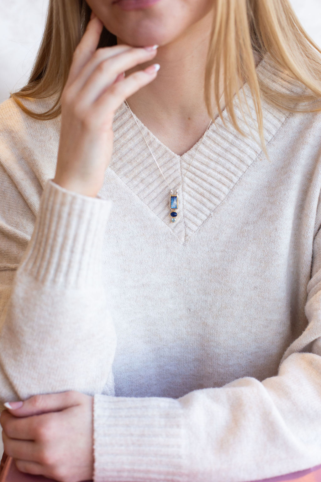 Sterling silver & 22 Karat yellow gold vermeil bezel set moonstone, agate & blue topaz pendant on an 18″ box chain. Pendant is 1 5/16″ in total length, including bale.