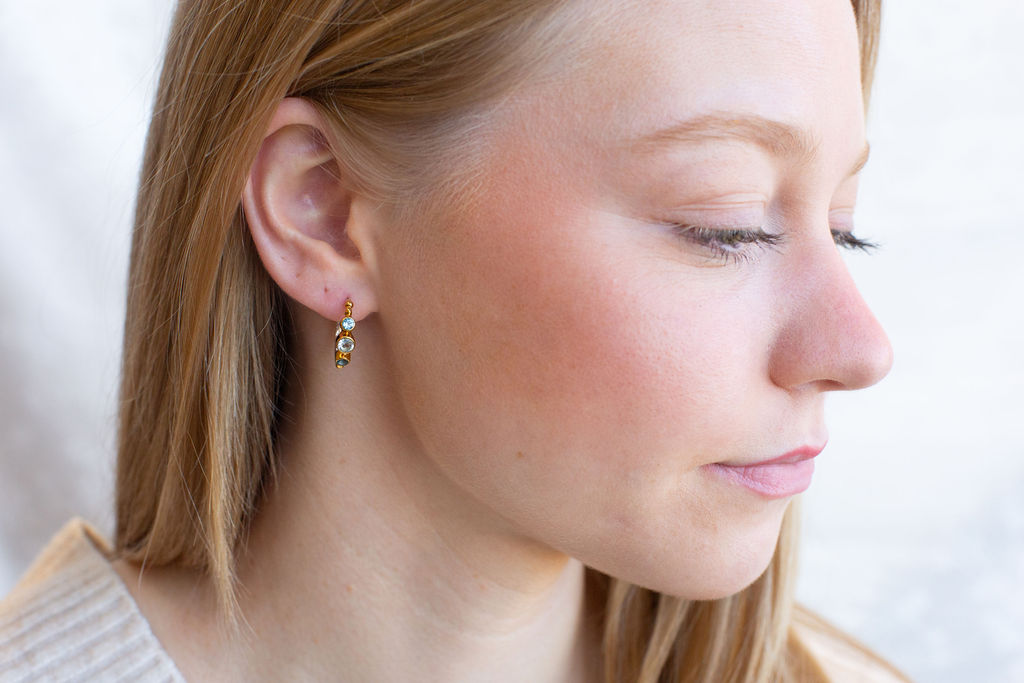 Sterling silver & 22 Karat gold vermeil hoop earrings bezel set with 6 blue topaz. 3/4″ in total length.