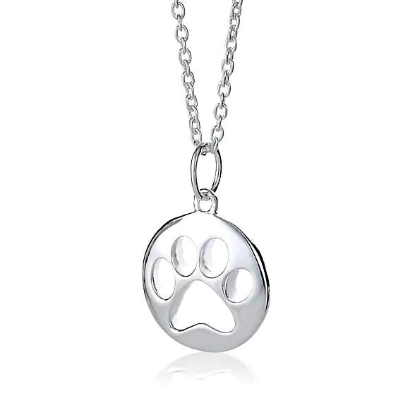 Sterling silver cut-out paw print disc pendant on a 16/18″ sterling silver chain. Pendant is 5/8″ in diameter.