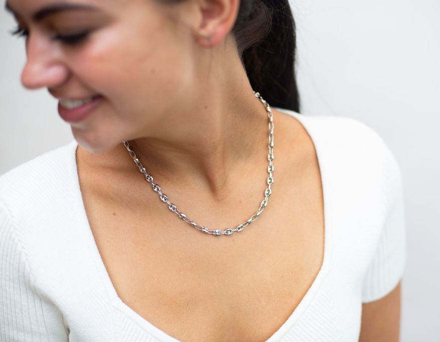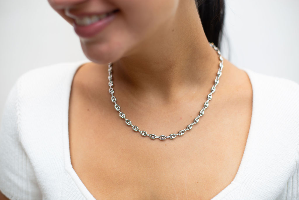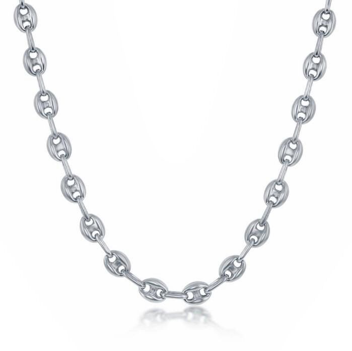 Sterling silver puffed marina link 18″ chain necklace with lobster clasp.