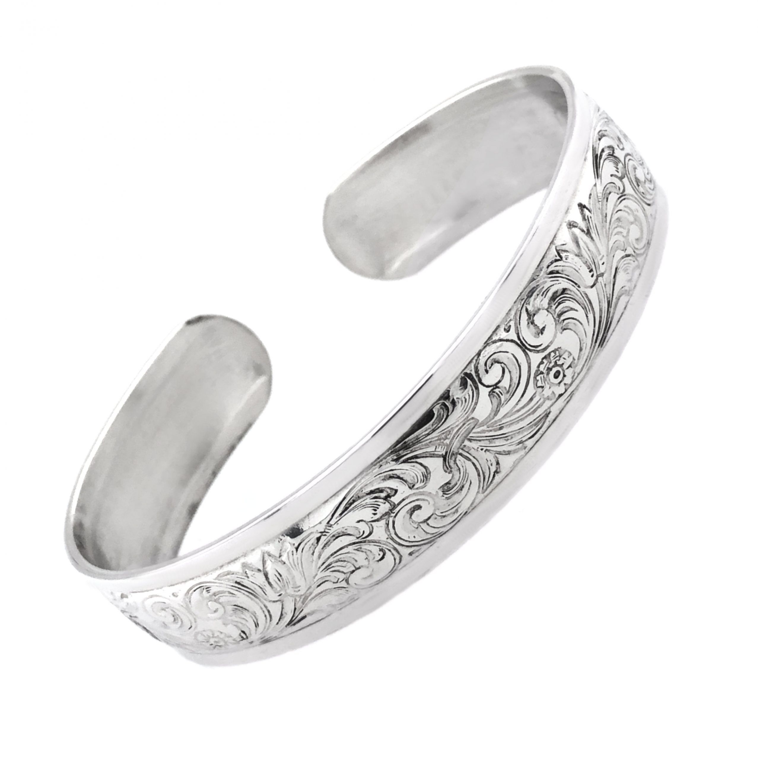 Sterling silver cuff bracelet embossed with floral scroll design. 1/2″ wide.