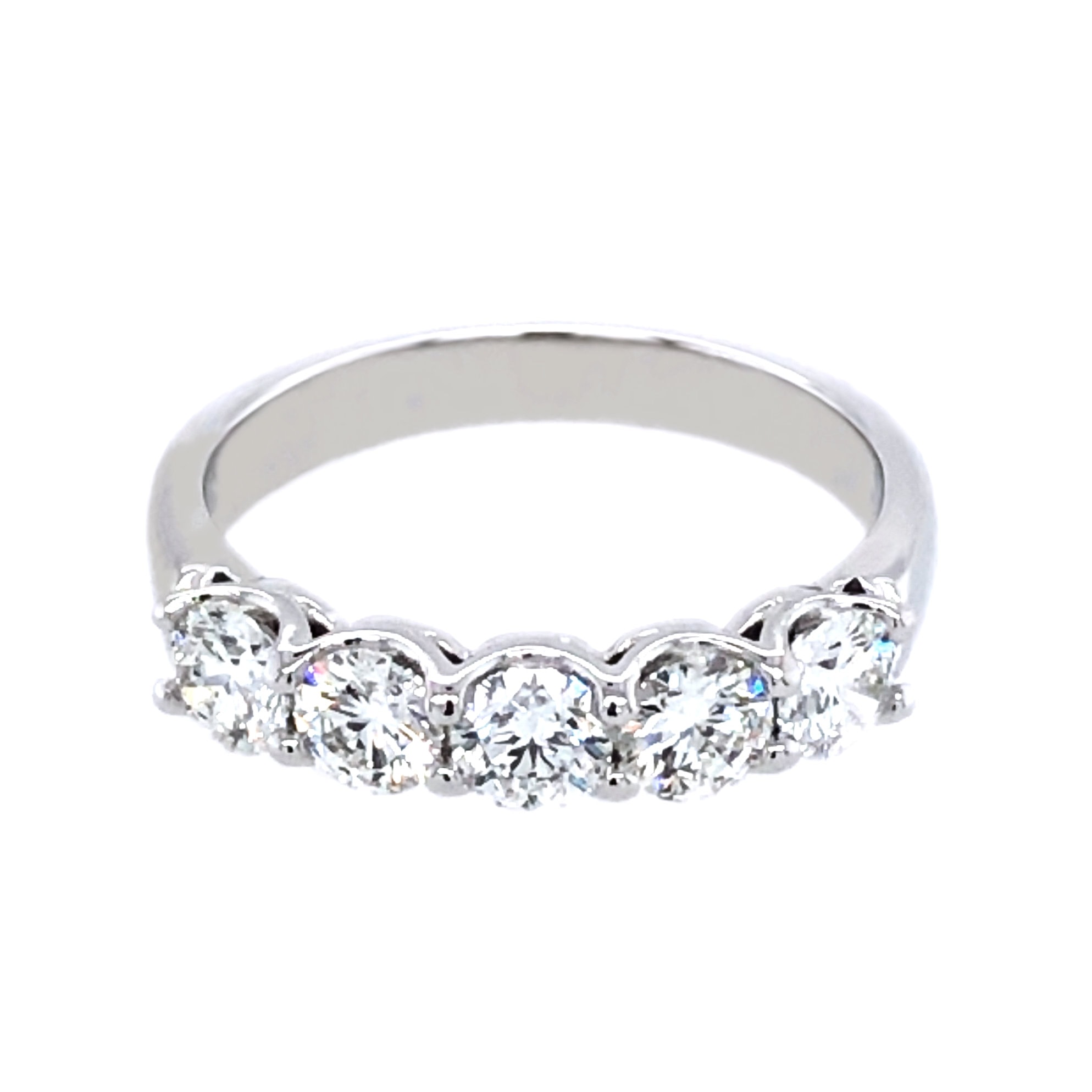 18 Karat white gold wedding ring set with 5 diamonds totaling 1.02 carat. Current size 6 1/4.