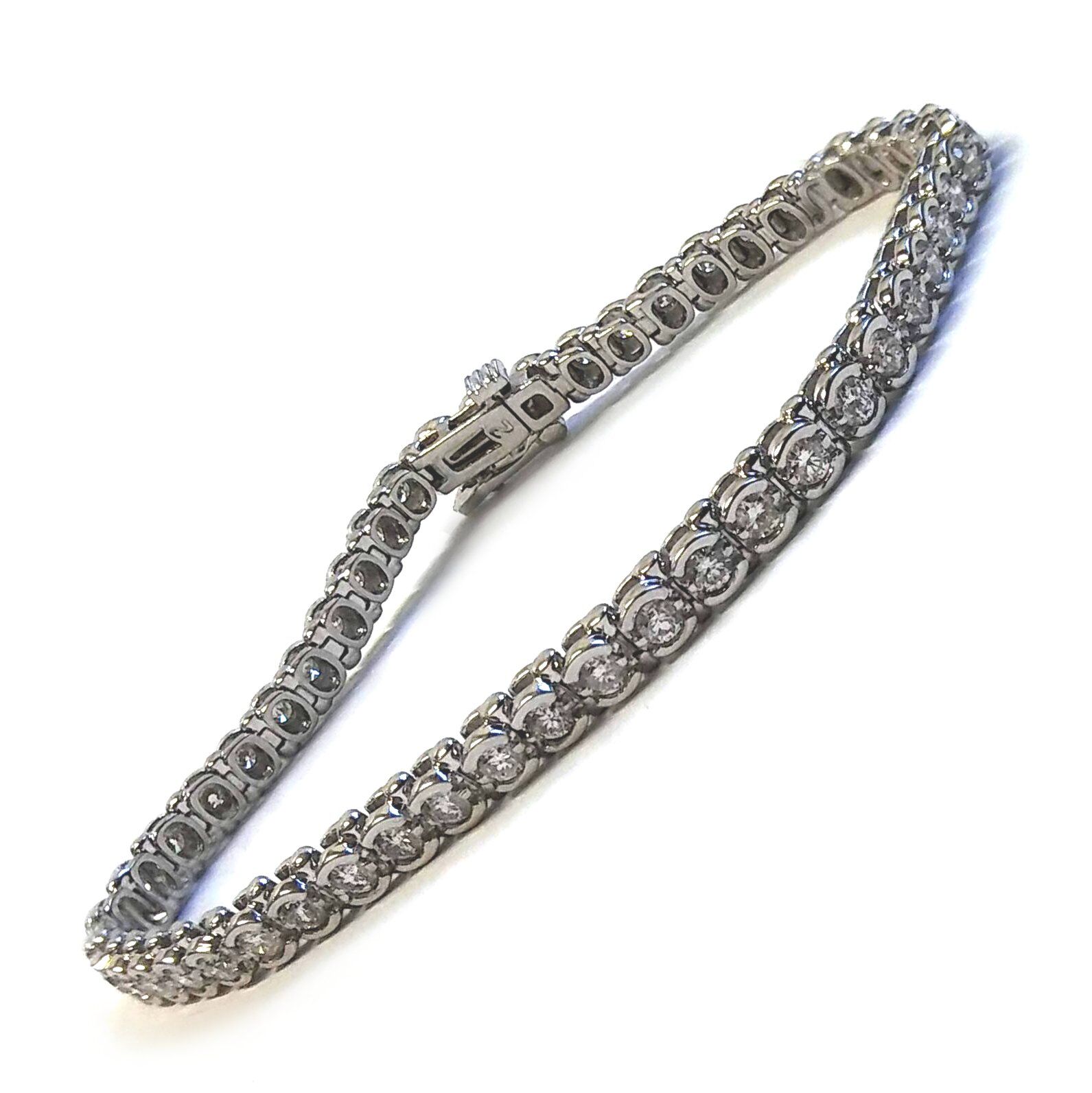 14 Karat white gold in line bracelet set with 50 diamonds totaling 2 1/2 carats. Pre-owned.