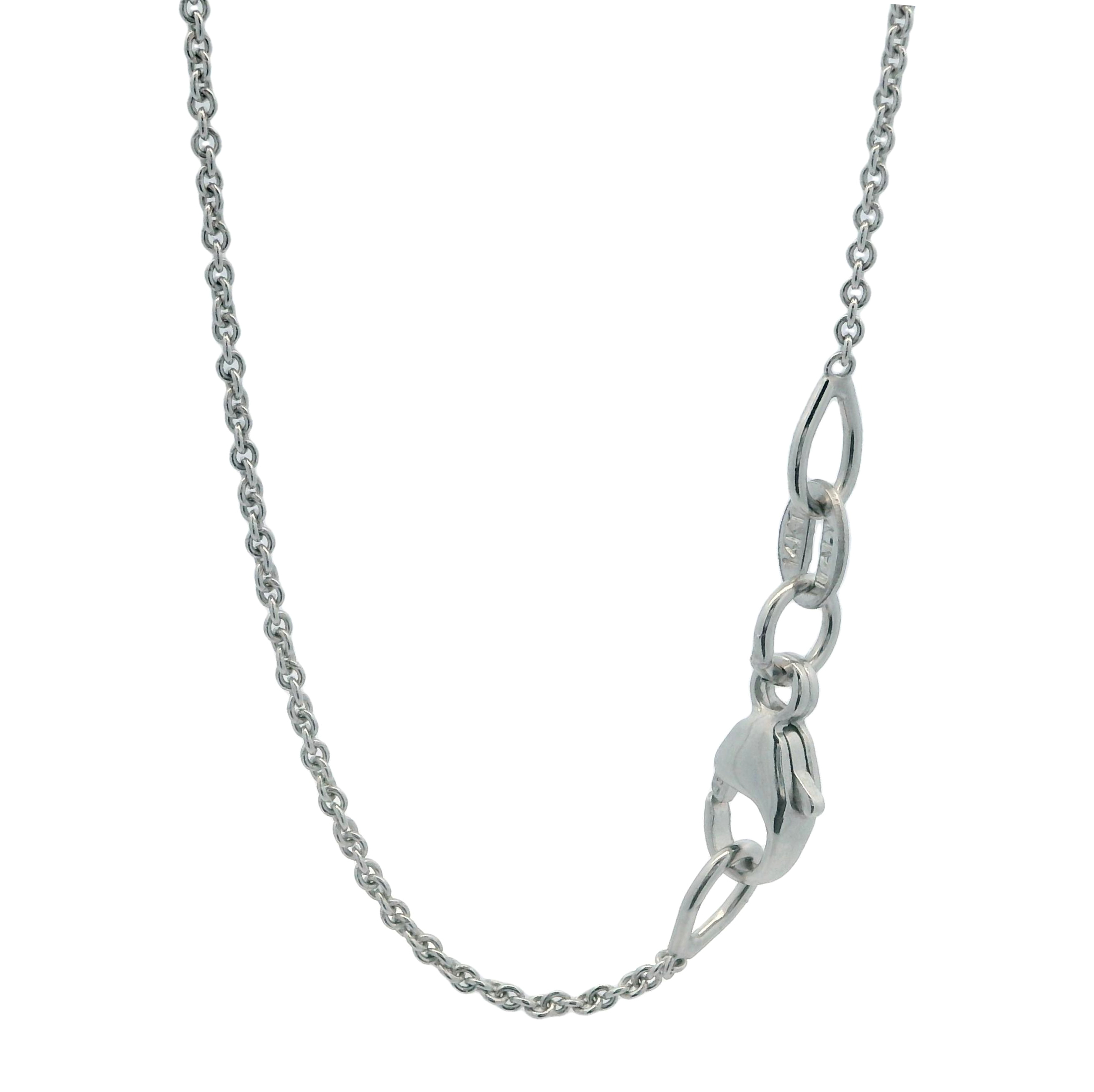 14 Karat white gold lion pendant on a 16″ .8 mm cable chain. Pendant is 11/16″ in total length. Pre-owned.