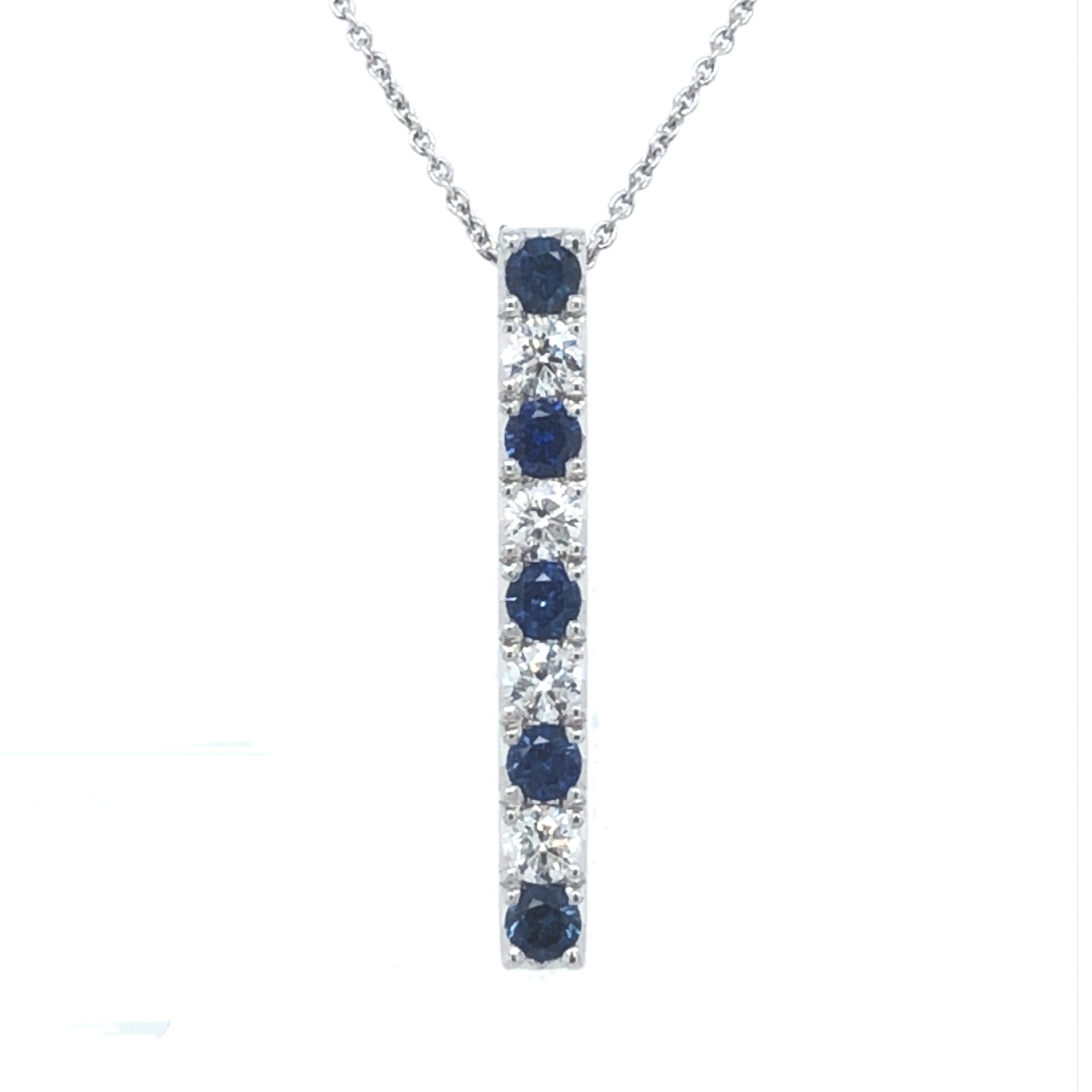 18 Karat white gold bar pendant set with 5 sapphires totaling .25 carat and 4 diamonds totaling .16 carat on a 17″ 18 Karat white gold cable chain with teardrop clasp. Pendant is 3/4″ in total length.