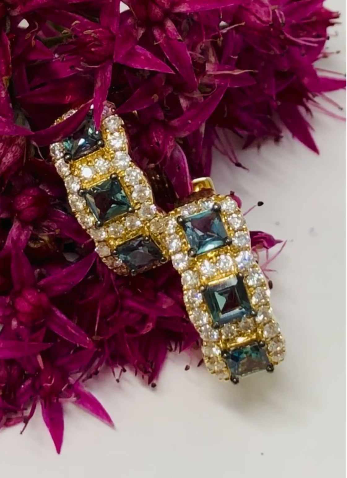 14 Karat yellow gold huggie hoop earrings set with 6 square alexandrites totaling .91 carat and 56 full cut diamonds totaling .37 carat. 11/16″ in diameter.