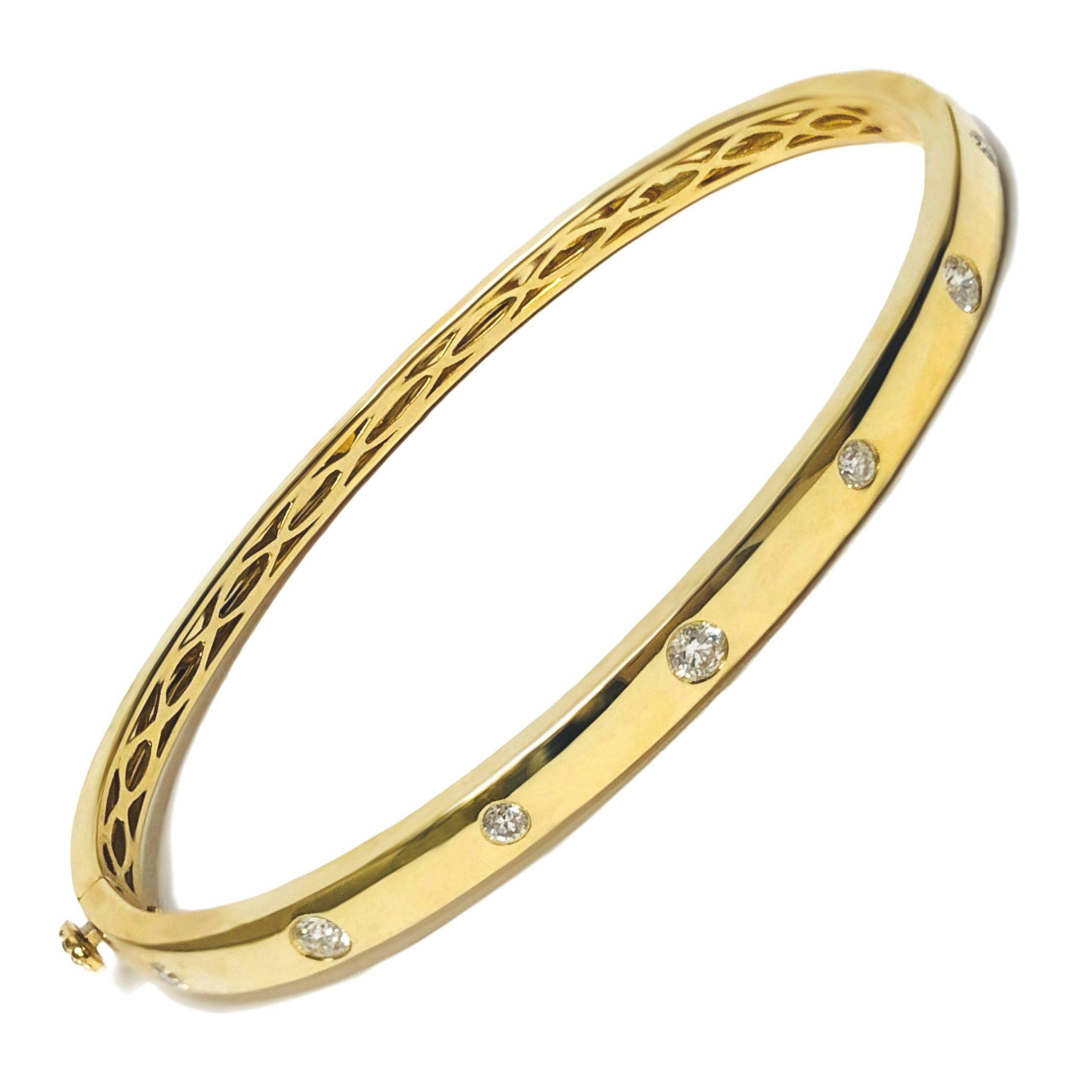 14 Karat yellow gold hinged bangle bracelet flush set with 7 diamonds totaling .40 carat. 2.5 – 3.2 mm wide, 1 – 1.5 mm thick.