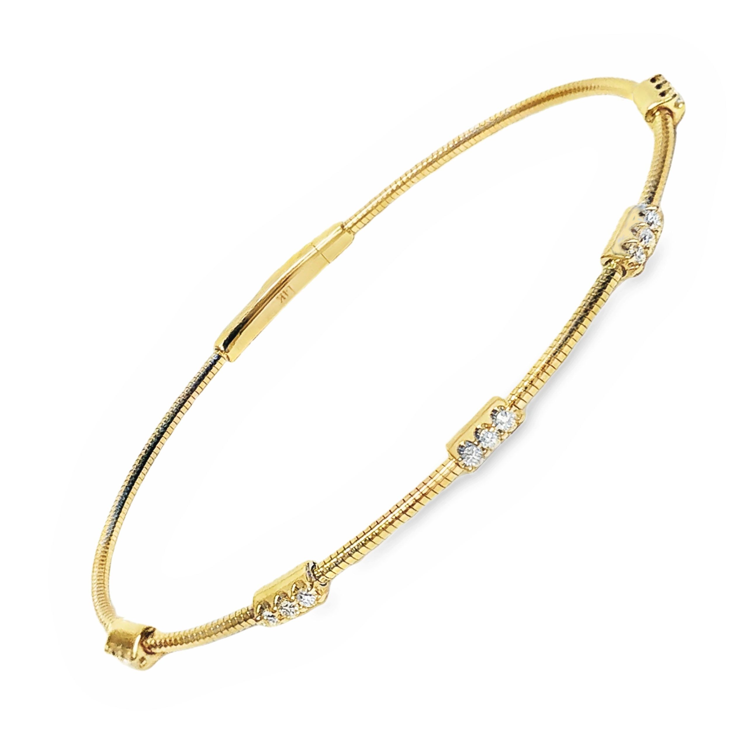 14 Karat yellow gold flexible ridged bangle bracelet set with 15 diamonds totaling .20 carat.