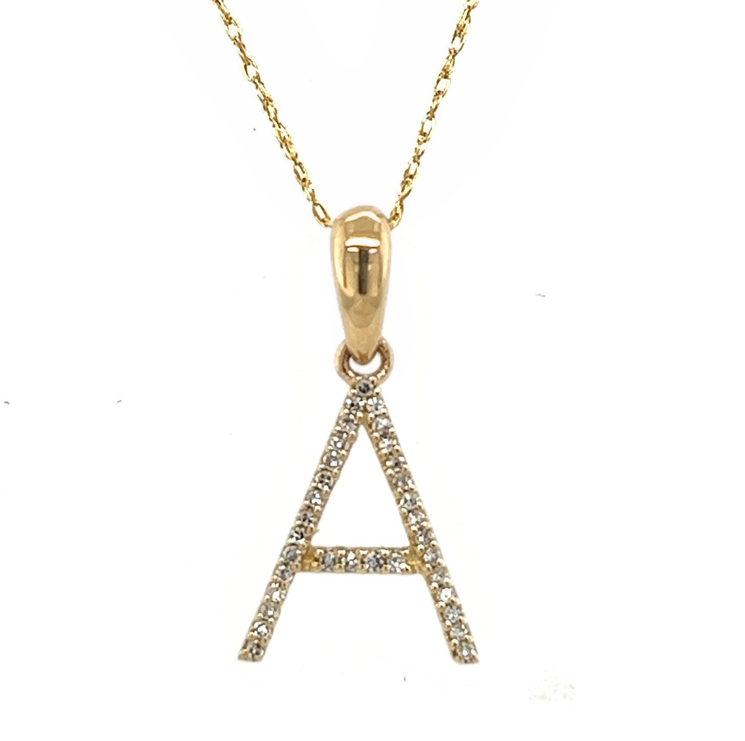 14 Karat yellow gold diamond-set initial pendant on a 16-18″ yellow gold chain. Pendant is about 3/4″ in total length.