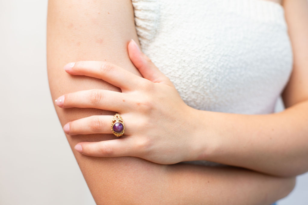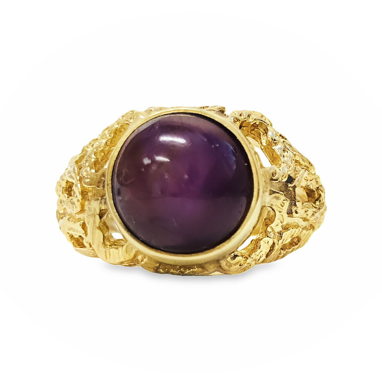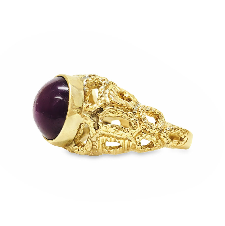 14 Karat yellow gold vintage ring bezel set with a 10.1 x 7.2 mm round cabochon star ruby. Current size 7 1/4.