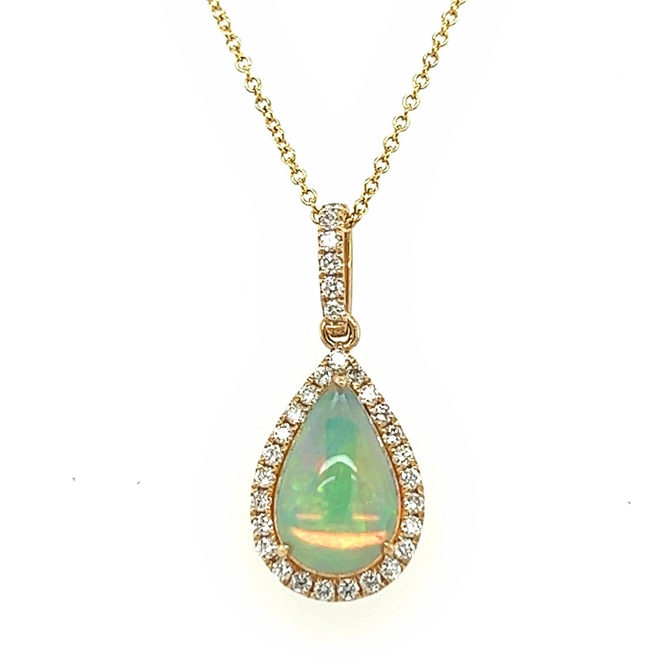 14 Karat yellow gold pendant set with a 2.14 carat pear shaped Ethiopian opal and 31 diamonds totaling .27 carat on a 16-18″ adjustable yellow gold cable chain. Pendant is 15/16″ in total length.