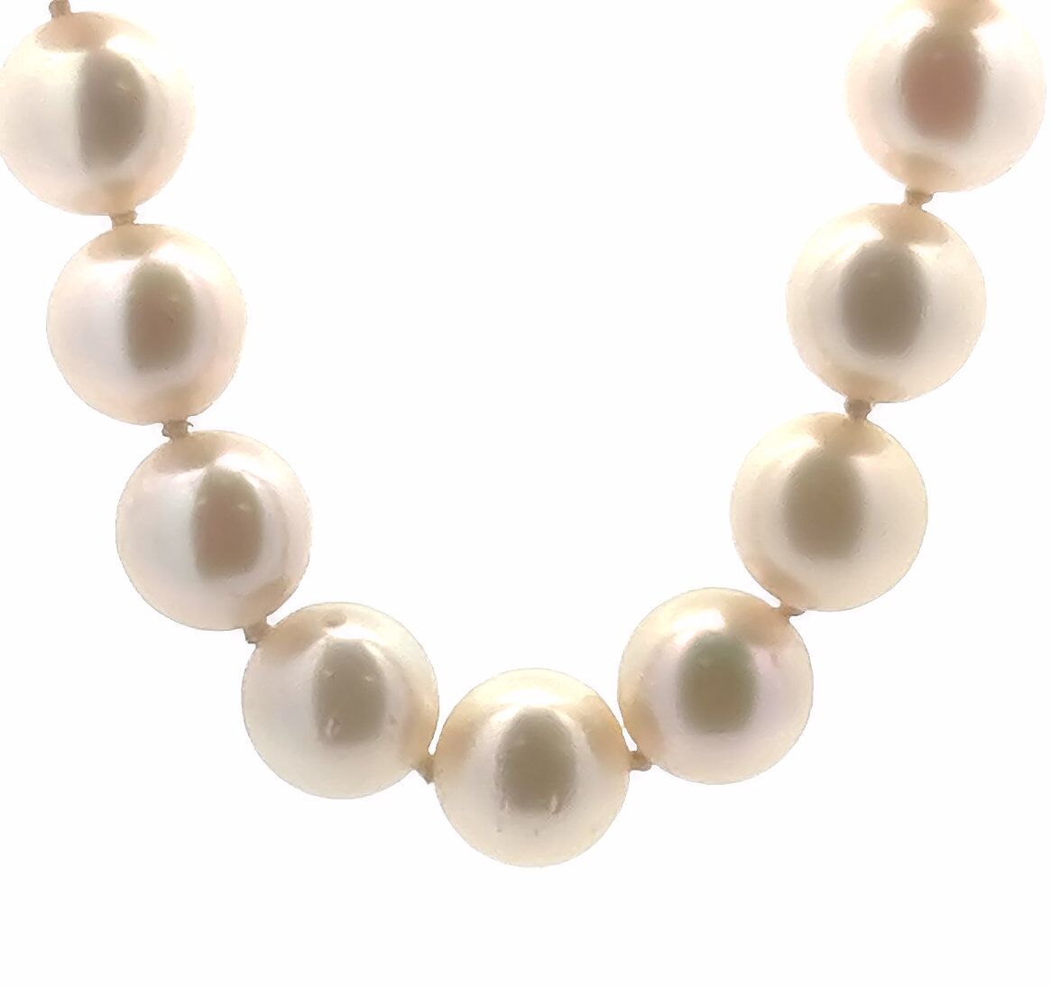 17″ 61 – 6.5-7 mm pearl necklace with 14 Karat yellow gold corrugated ball clasp. Pre-owned.