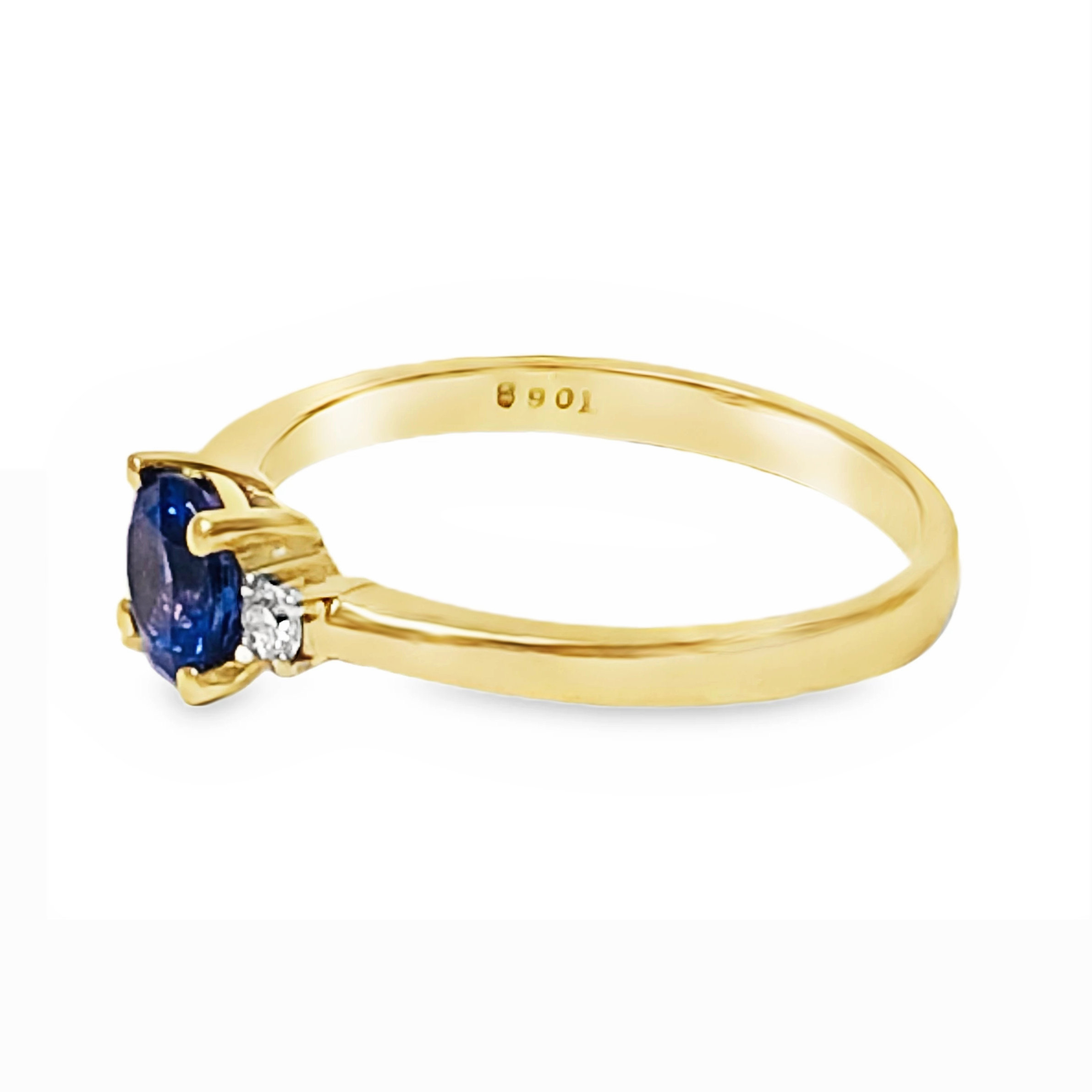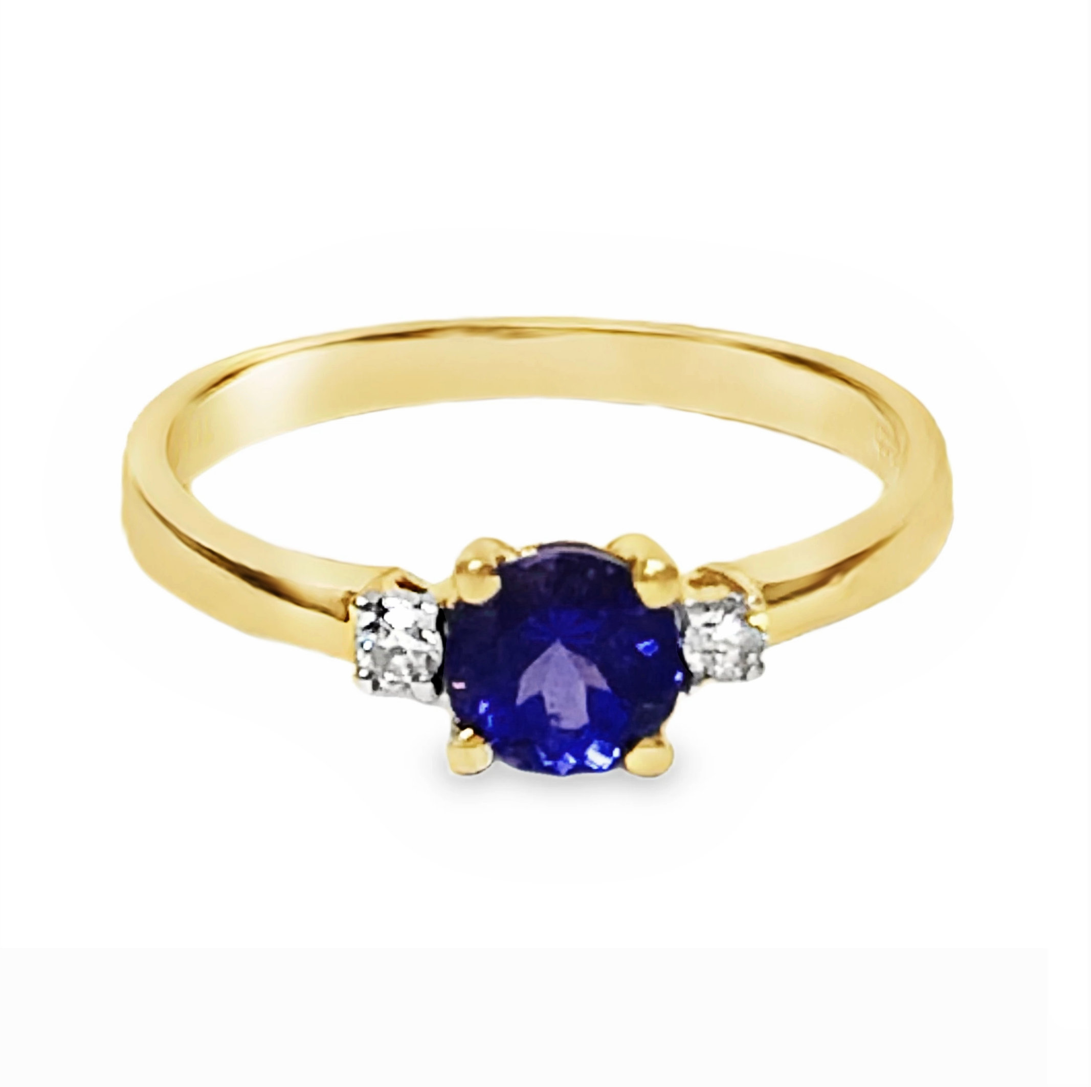 14 Karat yellow gold ring set with a 3/5 carat 5.2 x 3.7 mm round tanzanite and 2 – 2 mm diamonds. Current size 7. Pre-owned.