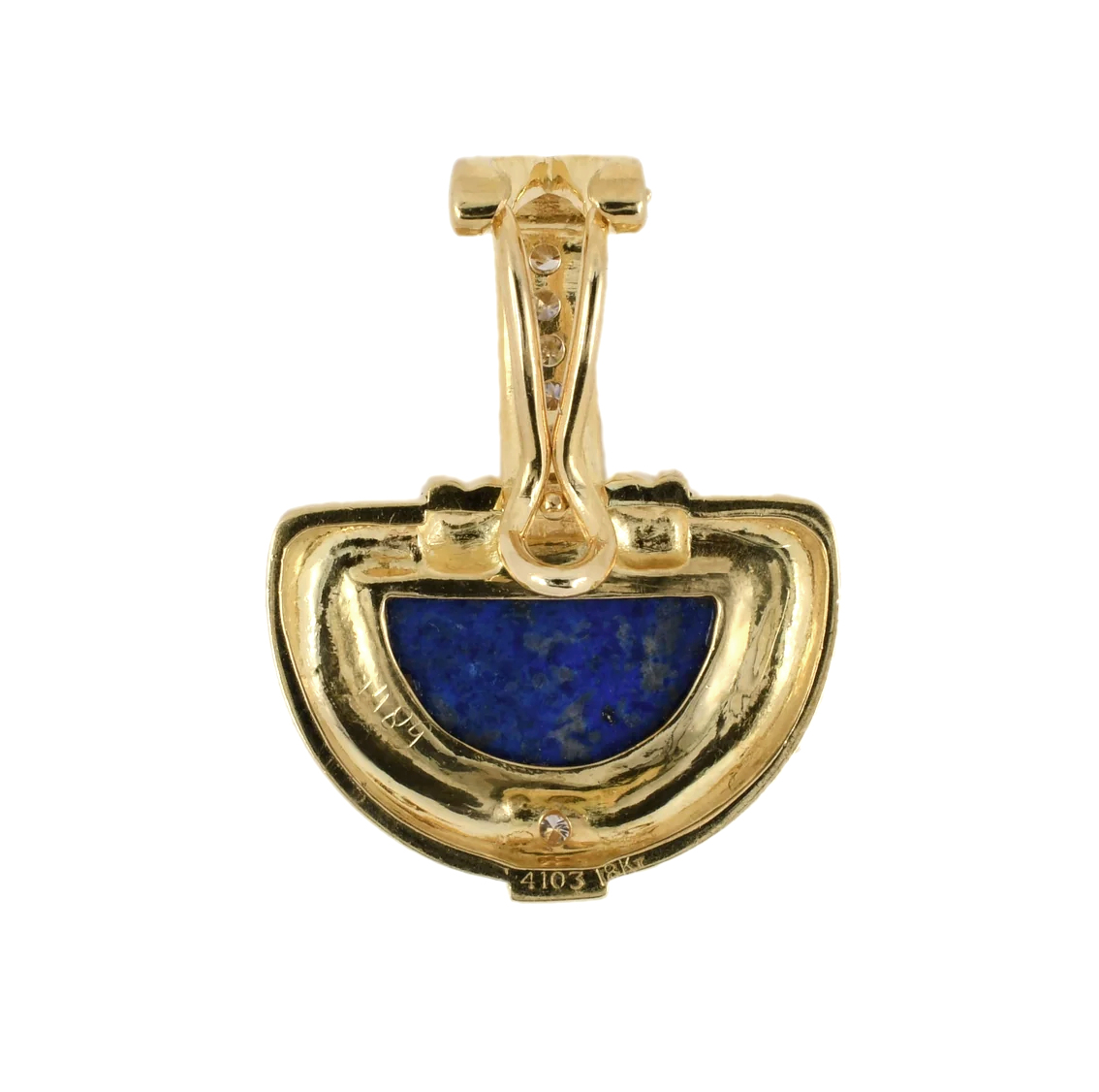 18 Karat yellow gold vintage hinged enhancer pendant set with 1 lapis and 7 diamonds totaling about .20 carat. Can be worn with pearl necklace or on a chain. 1 1/8″ x 7/8″.
