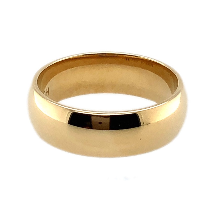 18 Karat yellow gold 7mm wide domed wedding ring with high polish finish. Current size 10.5. Pre-owned.
