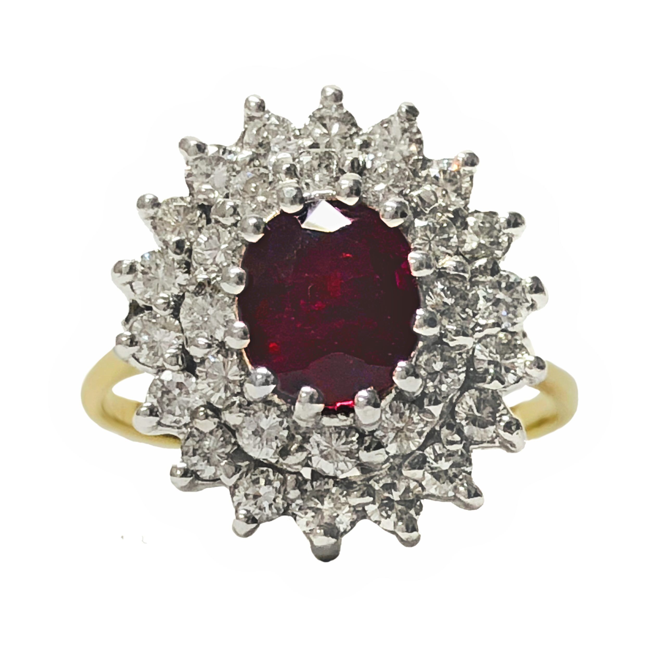 14 Karat yellow & white gold vintage ring set with an approximately 1 1/2 carat oval ruby and 30 full cut diamonds in a 2 tiered halo totaling about 9/10 carat. Current size 7.